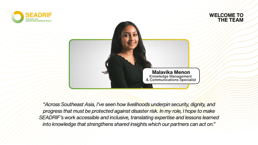 Malavika’s commitment to blend knowledge management and communications to make institutional operations and policies more inclusive and accessible—for both partners and the communities it serves—aligns strongly with SEADRIF’s role as a development insurer and thought leader in disaster risk financing across ASEAN.